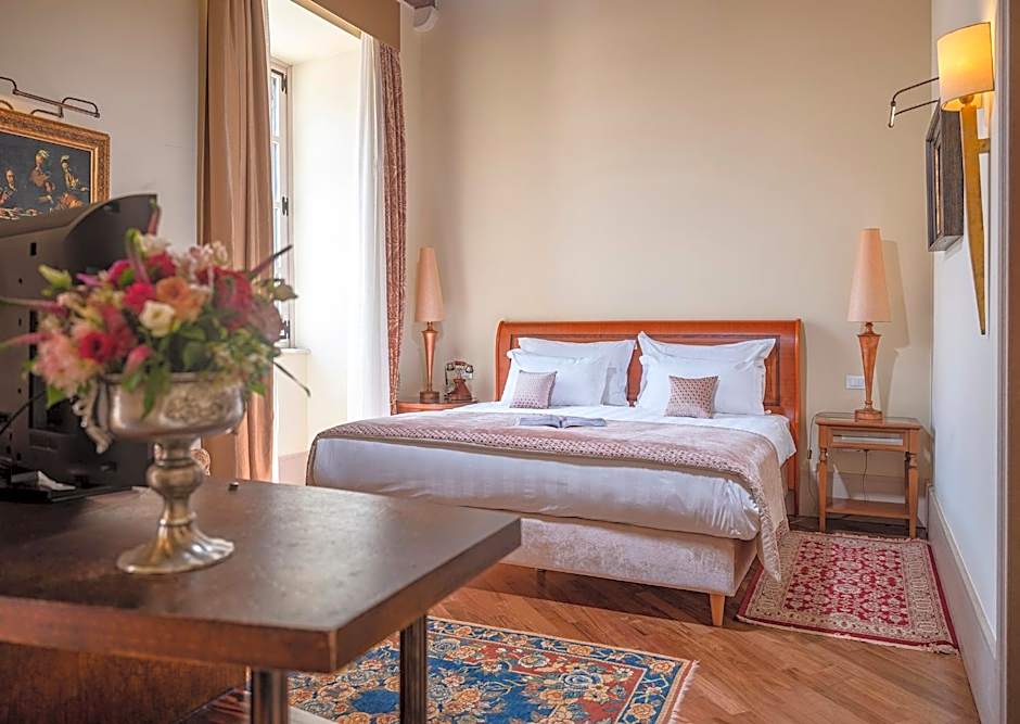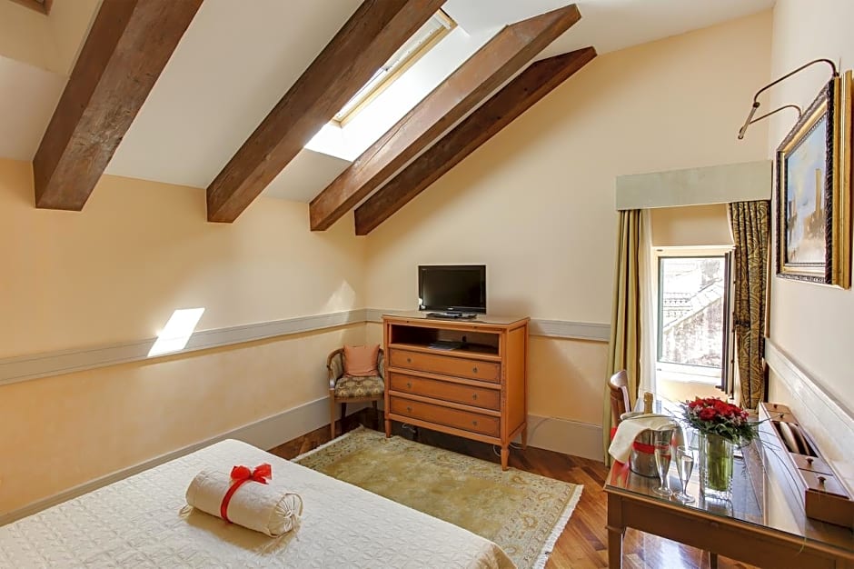 This double room features a Skylight windows at the mansards or limited street view, antique furnishings, AC, coffee and tea facilities, flat-screen TV, work desk and a mini-bar. Bathroom provides free Bvlgari toiletries, bathrobe, slippers and a hairdryer.